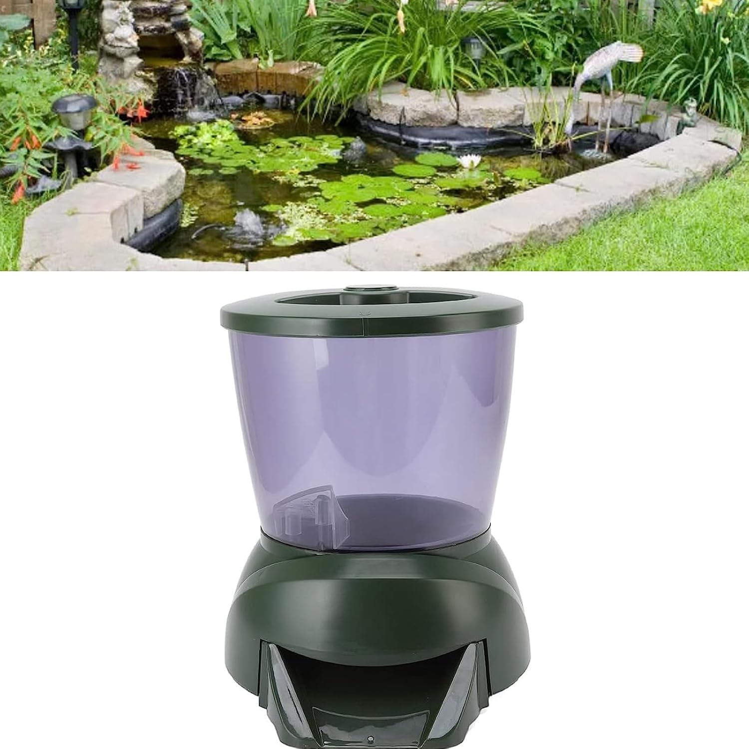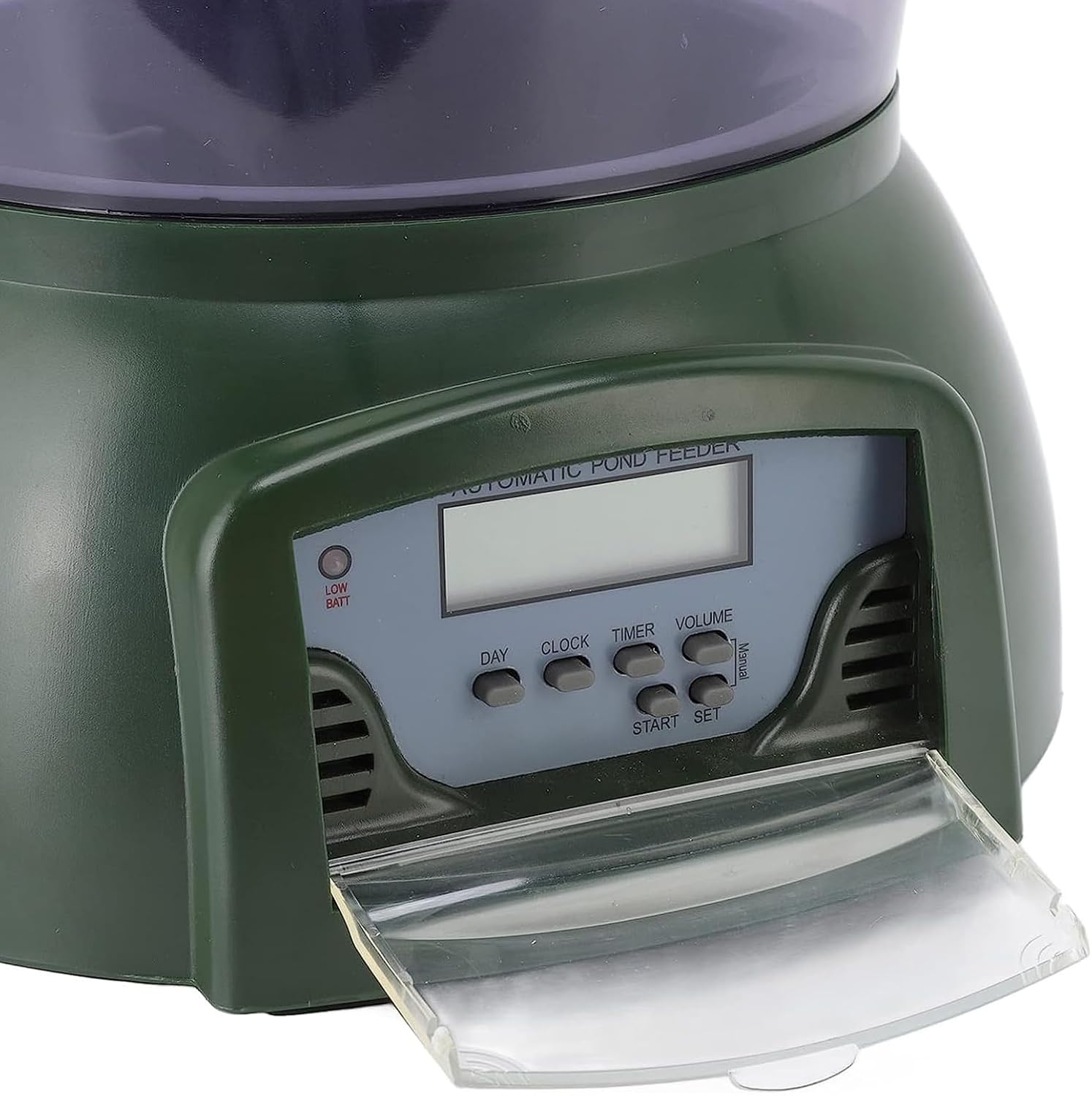 Product DescriptionFeature:1. 4.5L transparent grain storage bucket, can hold about 1.45kg of grain2. 12 or 24 hour clock display3. 1-4 times programmable feeding per day4. Automatic distribution of fish pond food5. Can be set to feed fish from 1 to 99 days6. Freestanding or base mounting7. LCD screen for easy operation, low battery indication8. Requires four C type batteries (not included)9. Removable feeder parts for easy cleaningProduct Size:Base: Approx. 22.5x33cm/8.9x13.0inHeight: Approx. 27.5cm/10.8inPackage List: 1 x Automatic Fish Feeder 1 x Discharge Port 2 x Fixing Bracket 2 x Fixing Screw 1 x Instruction ManualNote: 1. If you need to use the feeder for a long time, we recommend that you do not install low grade or even shoddy batteries.2. Do not get this part wet, and do not wash it with running water.3. Do not put these parts into the dishwasher, otherwise they will be permanently damaged.4. All data are measured manually, and there are certain errors in the measurement results.
