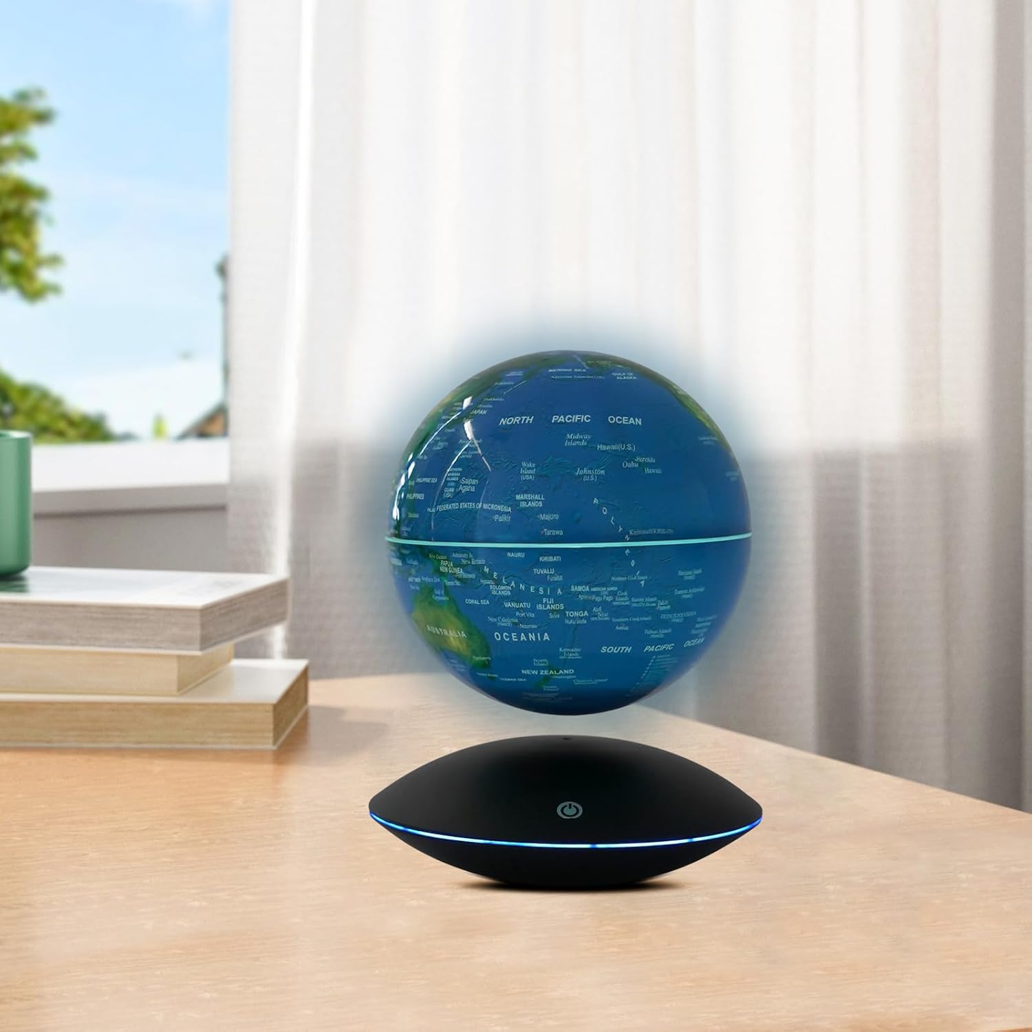 Details Automatic Adsorption: The globe can be automatically adsorbed on the base when it is dropped, preventing the product from falling directly on the ground and causing damage during accidental power cuts. Touch Switch: It allows you to easily switch the blue light to a colorful gradient light. Long Power Cord: The 4.92 ft long cord reduces the distance limitation when installing, allowing you to place the product more freely.Application It is a great decoration for homes, schools, offices, children's education, stores, meeting rooms, and more. As lights are mild, this product could be used as a night light which looks wonderful in the dark.Specifications Color: Blue Material: Silicone, ABS Process: Spraying Paint, Printing Map Type: World Map Light Source: LED Power Source: Corded Electric Plug Type: US Standard Light Color: Blue, Colorful Control Mode: Touch Control Mount Type: Table Standing Installation Required: No Power: 3 - 5 W Energy Consumption: 1 - 2 kWh / Month Voltage: 100 - 240 V Power Cord Length: 1.5 m / 4.92 ft Product Overall Height: 25 cm / 9.84 in Suspended Height: 2 cm / 0.78 in Base Size (D x H): 15 x 5 cm / 5.9 x 1.96 in Globe Diameter: 15.2 cm / 6 in Package Size: 23 x 22 x 20 cm / 9.06 x 8.66 x 7.87 in Gross Weight: 1.9 kg / 4.19 lbs Net Weight: 1 kg / 2.2 lbsPackage Includes 1 x Globe 1 x UFO-shaped Base 1 x Power Adapter 1 x English ManualNotes Please check the size carefully before ordering. Please keep this item at least 7.87 inches away from computer devices and other electronic devices and metal. Please don't unplug the power adapter without removing the globe first, or the globe will pound the base. In order to prevent damage to the circuit and ensure the long life of the product, if the suspension fails after several attempts, please unplug the power supply and wait for three minutes or more before trying the suspension operation again. Please note that the globe can only be wiped with a cloth, not rinsed with water. Please kindly put the globe on the base when it is not powered on.