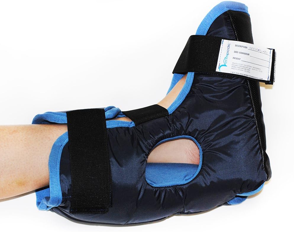Ventopedic Heel and Ankle Offloading Boot with many layers of moisture control fabric and a 3-dimensional structure inside the product off-loads pressure on the three critical pressure ulcer areas - the heel, the lateral malleolus, and the medial malleolus. Ventopedic fabric contains controlled levels of hydrophobic and hydrophilic fibers that attract and expel skin moisture four times faster that regular fabric, keeping skin drier, eliminating odors and lessening the chance of skin breakdown. The fabric actually draws moisture away from the skin and allows it to escape. Clinical test results confirm that the Ventopedic fabric will remain dry even under extreme humidity conditions (38ºC/98% humidity). The boot does not absorb moisture. Large cutout on each side of the boot allows for air circulation and easier visualization of the lateral malleolus. Adjustable straps are soft against the skin. Fits left or right. Machine washable and dryable. Fabric Content 90% polyester 10% cotton. Washing temperature 160-167 degrees F (71-75 degrees C). Drying temperature 220 degrees F. Large fits calf circumference 17-20", boot height 9".