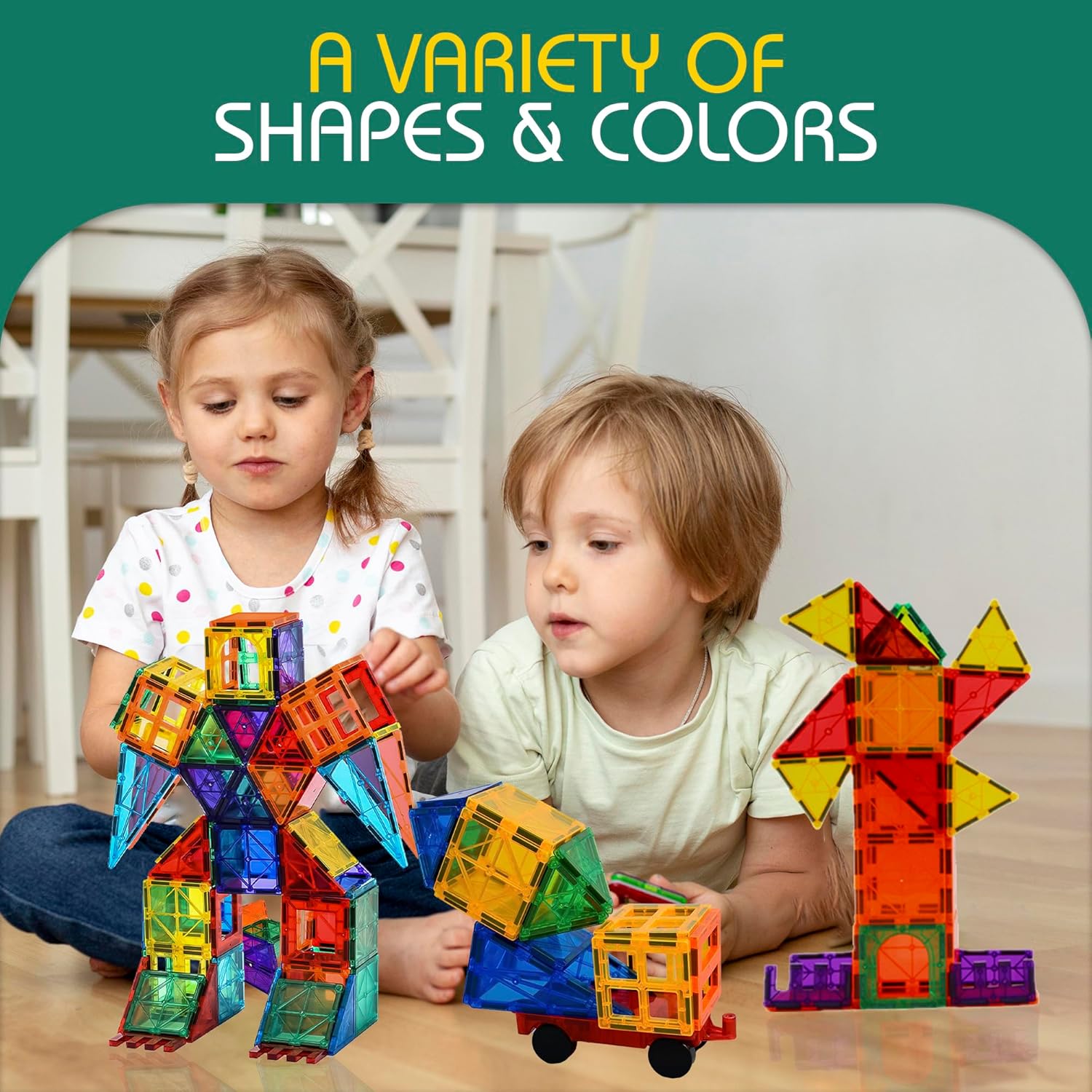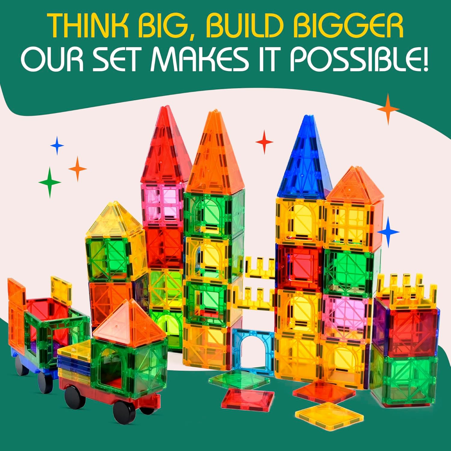 LittleVo Magnetic Building Blocks are designed to spark creativity, learning, and endless fun for kids aged 3 and up. This 136-piece set includes vibrant magnetic tiles in various shapes, 2 magnetic cars, and 8 non-magnetic alphabet tiles While 100-piece set includes 2 magnetic cars, and 4 non-magnetic alphabet tiles. With strong magnets that are stronger than competitors, kids can securely build tall, complex structures without frustration. From castles to rockets and vehicles, the possibilities for 2D and 3D creations are endless, and the included premium idea booklet with step-by-step instructions helps guide both beginners and advanced builders. Crafted from high-quality, non-toxic, BPA-free ABS plastic with smooth, rounded edges, LittleVo tiles are safe for small hands and durable enough to withstand years of play. Using advanced ultrasonic welding technology, the tiles are completely secure and built to last, giving parents peace of mind. Meeting CPC safety standards, these magnetic blocks are ideal for toddlers and kids, making learning through play a worry-free experience. LittleVo Magnetic Tiles are a perfect STEM toy, helping children develop problem-solving skills, spatial reasoning, motor skills, and shape recognition while fostering creativity and imagination. The alphabet tiles add an extra educational touch, supporting early literacy through hands-on play. Whether for independent play, family bonding, or group activities, this versatile set keeps kids engaged for hours. Packaged in a beautifully designed gift box and paired with a premium fabric storage bag for easy cleanup, LittleVo Magnetic Tiles make an ideal gift for birthdays, holidays, or special occasions. Compatible with other leading brands like Magna Tiles and Picasso Tiles, they are a great addition to any collection and provide endless entertainment. Give your child a toy that combines creativity, education, and fun with LittleVo Magnetic Tiles—where imagination knows no limits!