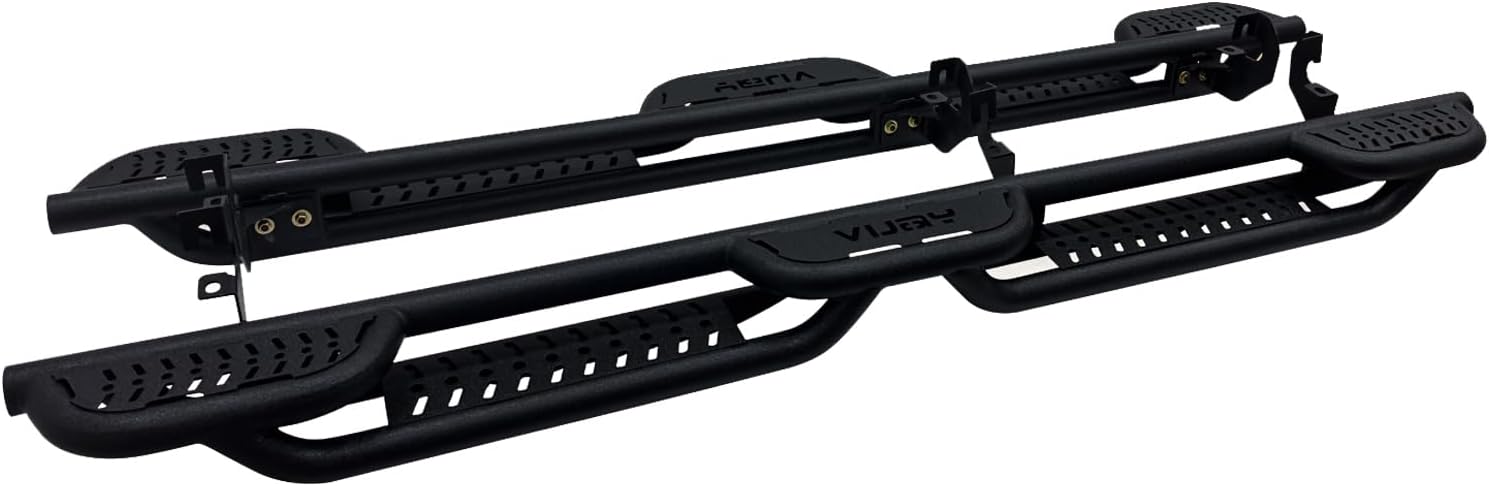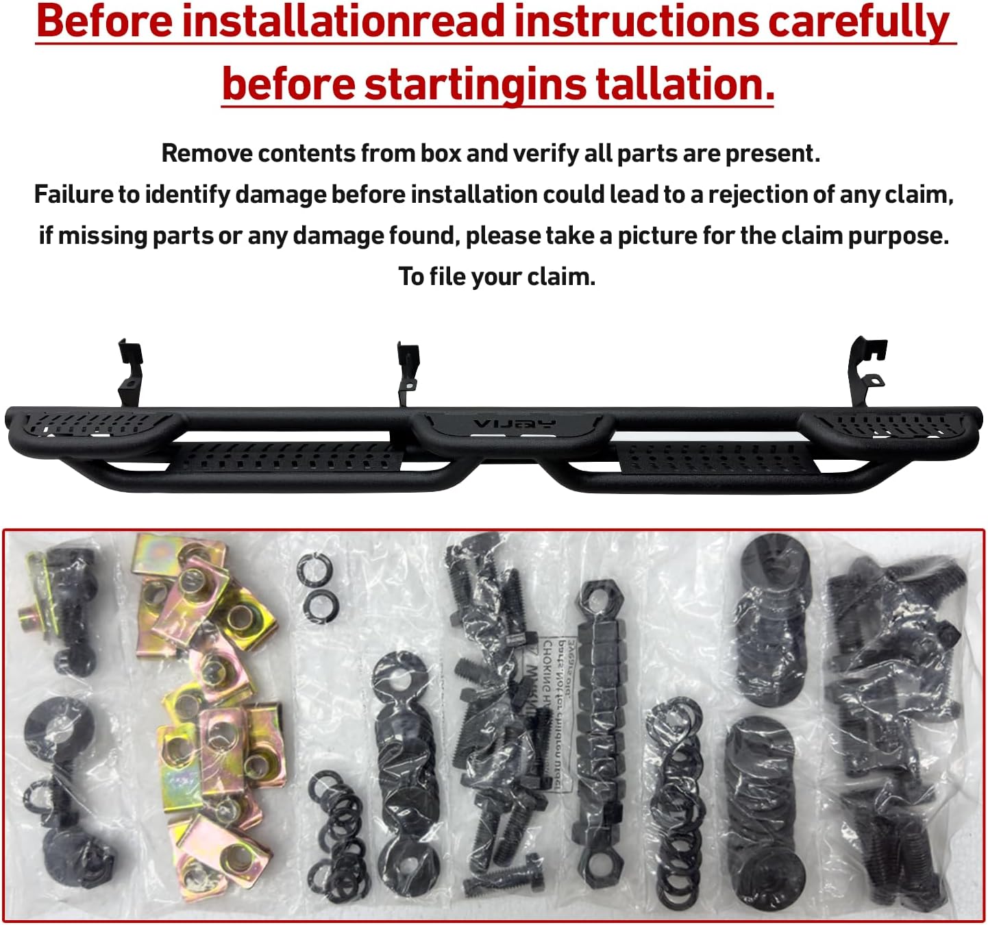 Functional Protection: 6 inch side steps feature two-stair layout to provide better convenience for vehicles with lift kits and oversized wheel tires. Also allows for easier rooftop operation. Three-tube design provides more protection for the bottom and the side of the car, also preventing from getting stuck on the rocker plate or hanging obstacles Bolt-on Installation: Welded brackets provide additional strength.Package contains 2 nerf bars, set of brackets & hardware; Installation can be completed within 20 minutes with no cutting or drilling Strong and Durable - Unique powder coating offers exceptional rust and corrosion resistance so you can drive under any condition. The laser cutting step plate achieves a non-slipping step surface and reinforced grip. Proven to handle up to 550 lbs. without bending No-hassle Service and Note: The bracket is not pre-welded on the step bars! Buy with confidence! Please confirm the cab picture in the listing before ordering. Should any inquiries arise, feel free to let us know directly. For your safety, professional installation recommended.